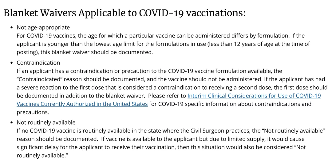 Advisory Committee on Immunization Practices (ACIP)美国免疫接种咨询委员会此前已经建议美国符合年龄人群接种新冠疫苗,所以该疫苗适用于符合年龄的身份调整申请人。