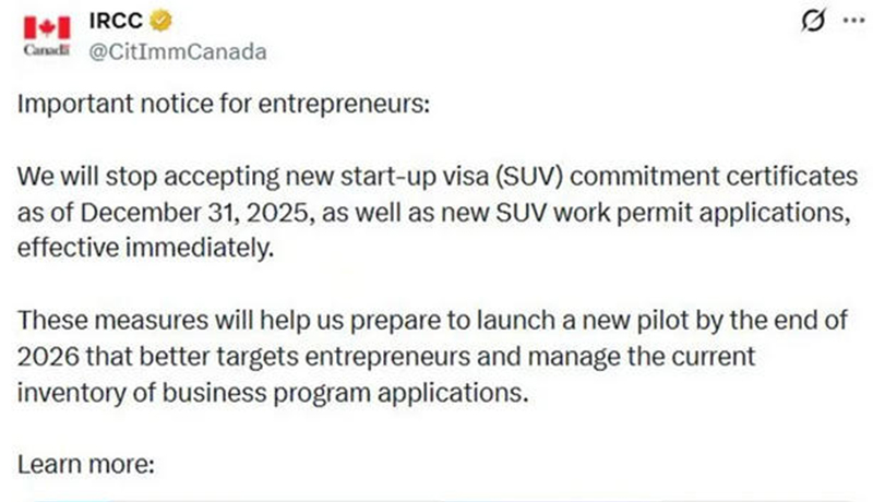 自2026年1月1日起,加拿大将暂停受理新的“创业移民计划(Start-up Visa Program,简称 SUV 项目)”申请,直至2026年底全新升级版的“SUV 2.0 版本”正式推出。