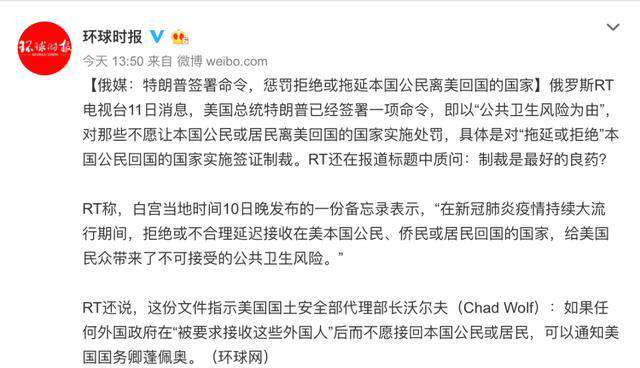 当再去翻初始微博的时候,内容很清楚“美国总统特朗普已经签署一项命令,即以“公共卫生风险为由”,对那些不愿让本国公民或居民离美回国的国家实施处罚,具体是对“拖延或拒绝”本国公民回国的国家实施签证制裁。”: