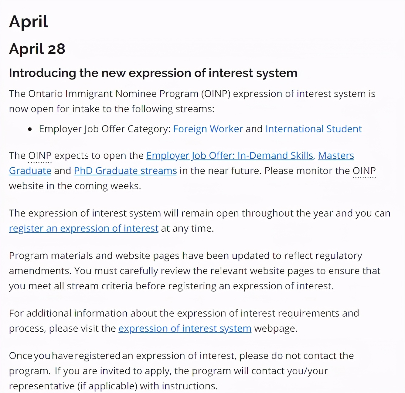 现在,大家期待安省省提名EOI系统终于在4月28日(加拿大时间)正式上线了。现在境内雇主担保和境外雇主担保已经可以递交注册。其他项目如硕士、紧缺职业、博士省提名会近期开放。