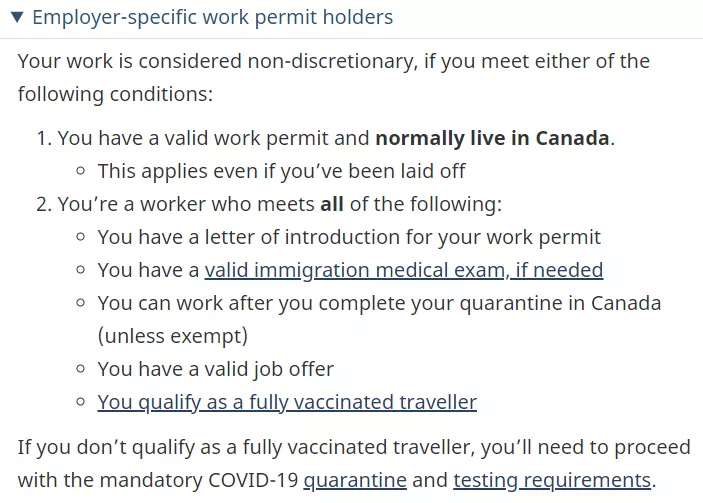 移民局给出的示例是:如果你持有开放式工作签证,且没有接种加拿大认可疫苗,那么你必须要有一份有效的Job offer才能进入加拿大。因此,持有开放式工签,且没有把握向边境官员证明你是加拿大常住临时居民(如有租房协议、车贷房贷等等材料),在入境加拿大前最好能够拥有一份有效工作offer。