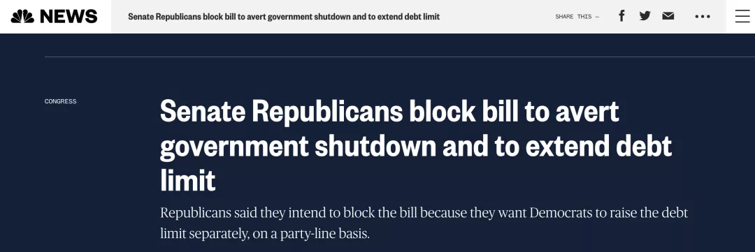 参院共和党27日晚,成功拒绝支持民主党挟带提高联邦借债上限的延长联邦政府运作的法案,如果执政的民主党无法及时提出替代法案,逆转政府30日关门、同时避免联邦债务于下月违约的新案,国家将朝财政危机边缘更近一步。