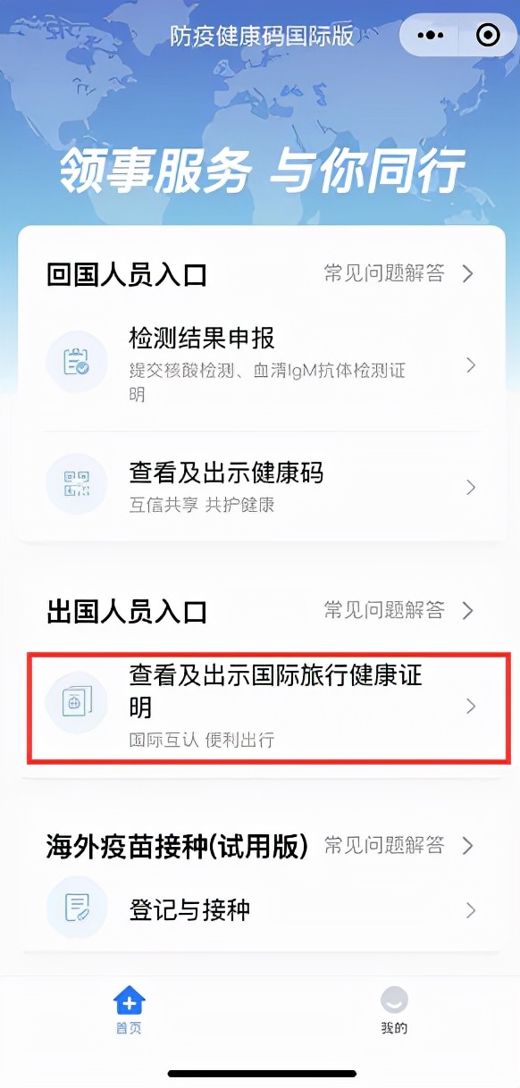 1、微信扫码进入小程序,选择“查看及出示国际旅行健康证明”进行操作。