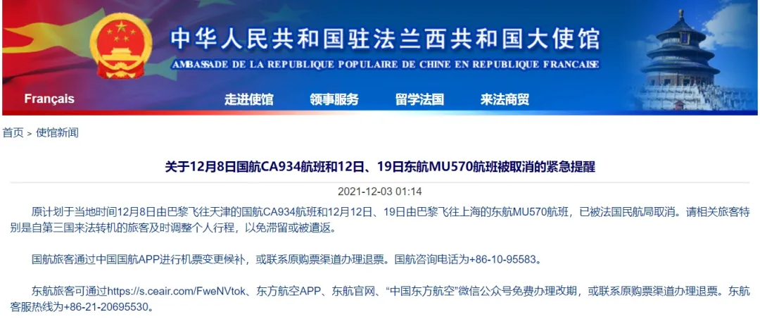 三个巴黎赴华航班取消 驻法国使馆提醒相关旅客注意