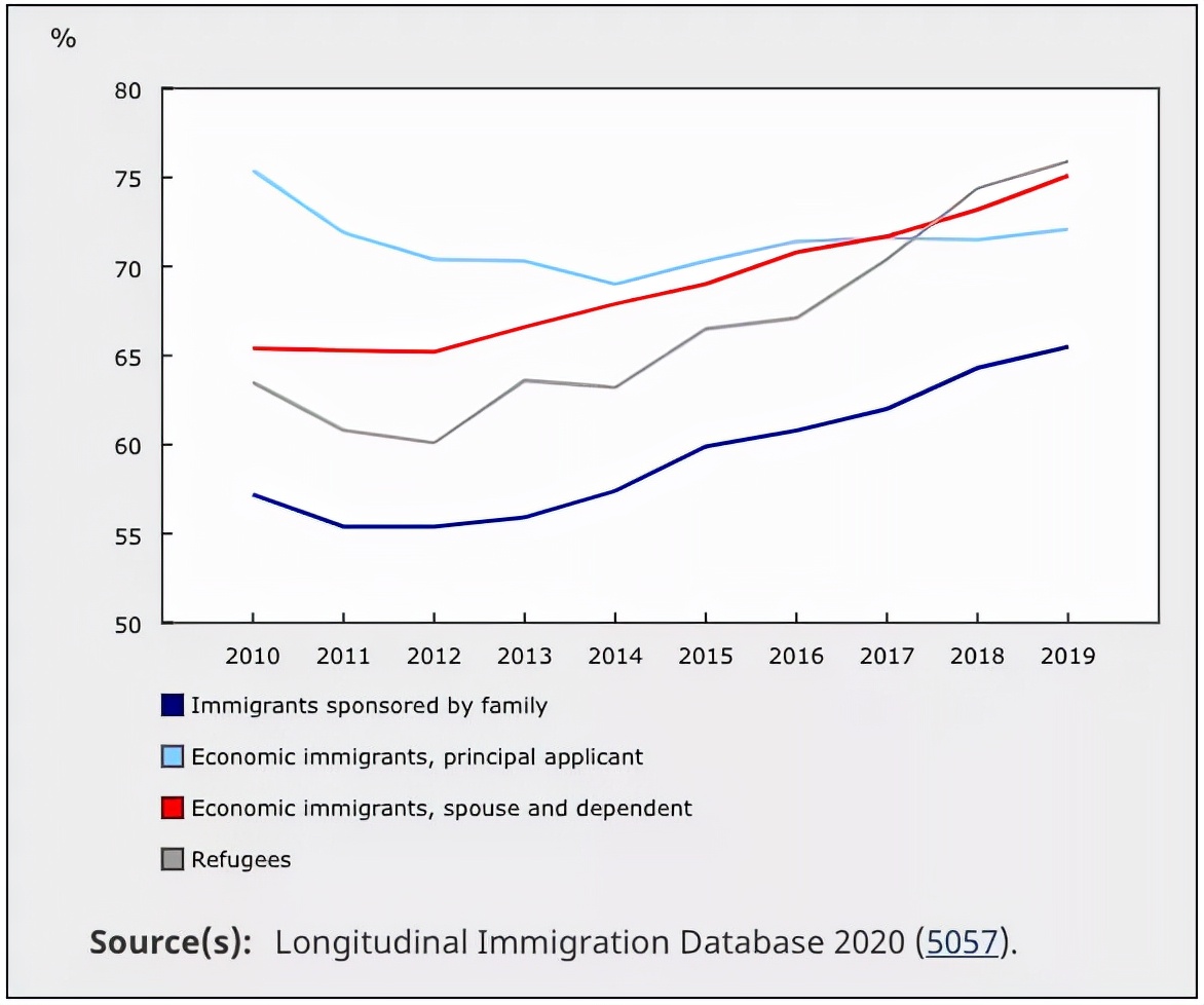 原因可能与经济类移民的申请条件有关,报告称,经济类别的主要申请人之所以能被选中,是因为他们有能力融入加拿大劳动力市场并为加拿大的经济发展做出贡献。他们中的大多数人都接受过高等教育,并且至少掌握一种加拿大官方语言,因此在融入当地社会时会更加容易。