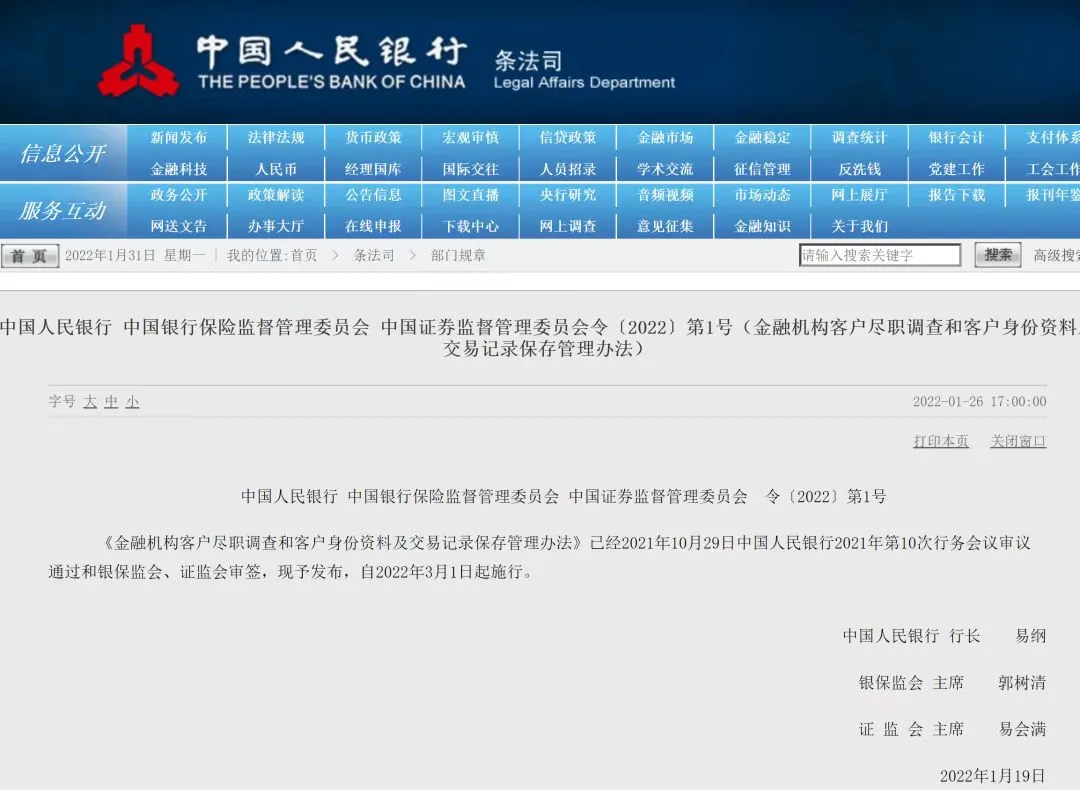 该热搜源于,中国人民银行、中国银行保险监督管理委员会、中国证券监督管理委员会日前联合印发的《金融机构客户尽职调查和客户身份资料及交易记录保存管理办法》,其中规定: