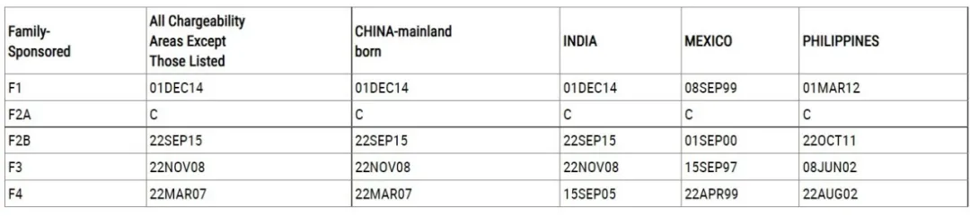 - F2B类 (永久居民的成年未婚子女<21岁及以上>)原地踏步;