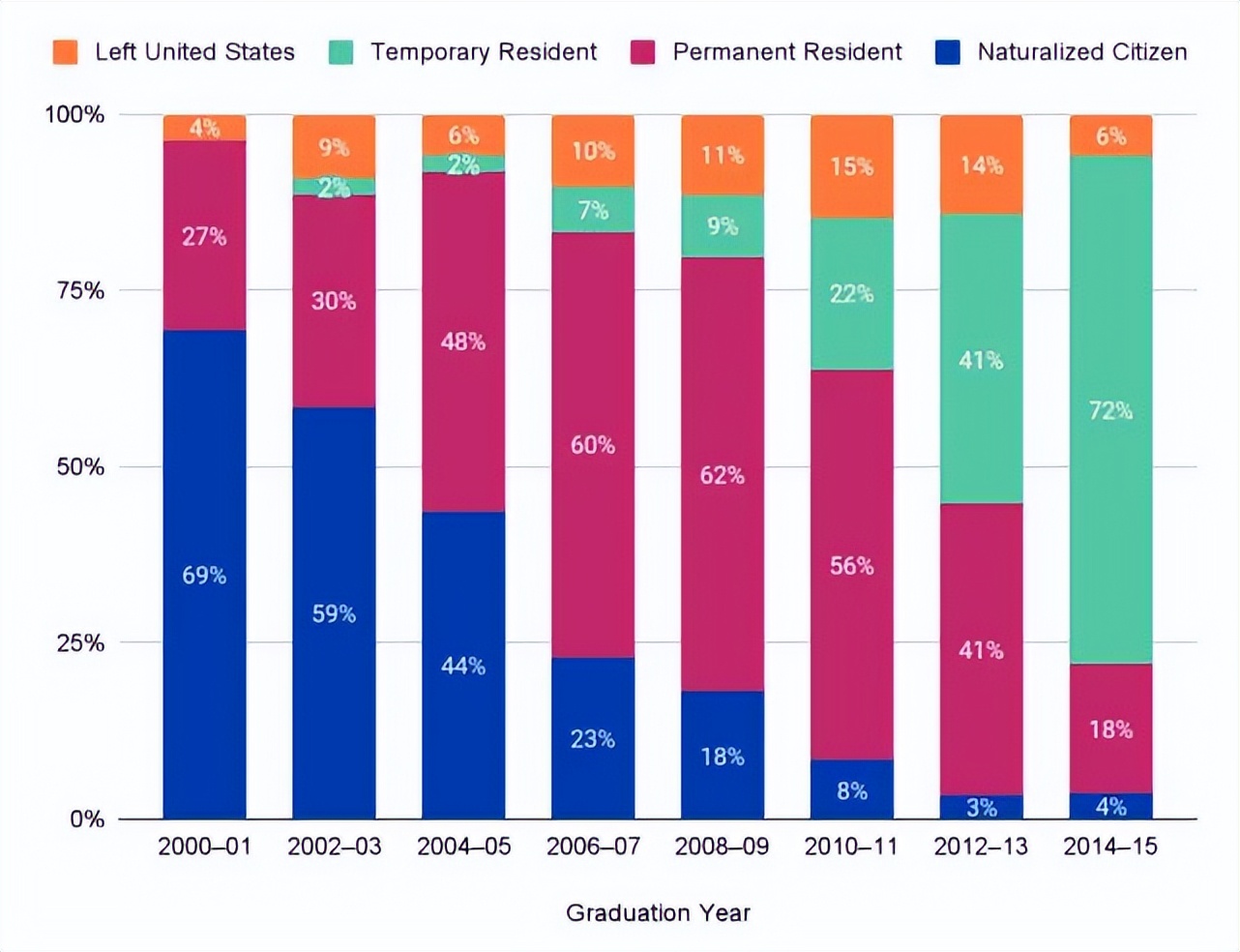 2000年至2015年期间,未学习STEM的国际博士毕业生的留存率约为55%,而STEM毕业生的留存率为77%。