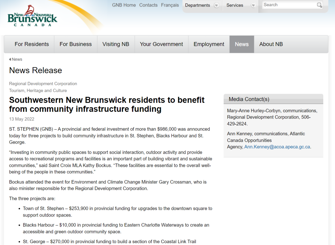 当地时间5月13日,ST. STEPHEN (GNB)宣布,纽宾士域省和联邦政府投资超过986,000加元,用于在圣史蒂芬St. Stephen、布莱克斯港Blacks Harbour 和圣乔治St. George建设社区基础设施的三个项目。