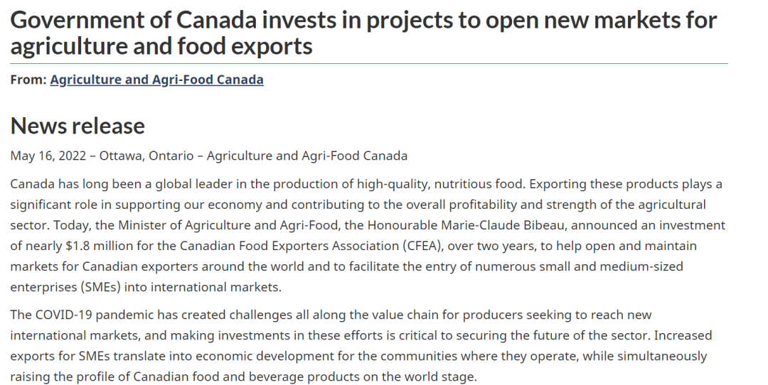 当地时间5月16日,农业和农产品部部长Marie-Claude Bibeau宣布,在两年内为加拿大食品出口商协会(CFEA)投资近180万加元,帮助加拿大出口商在世界各地打开和维持市场,并促进众多中小型企业(SME)进入国际市场。
