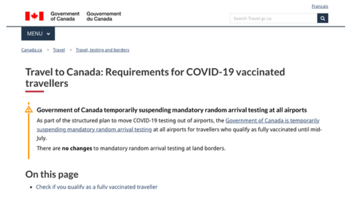 政府还要求所有旅行者,无论其公民身份如何,都将他们的疫苗信息和旅行证件上传到 ArriveCan应用程序。