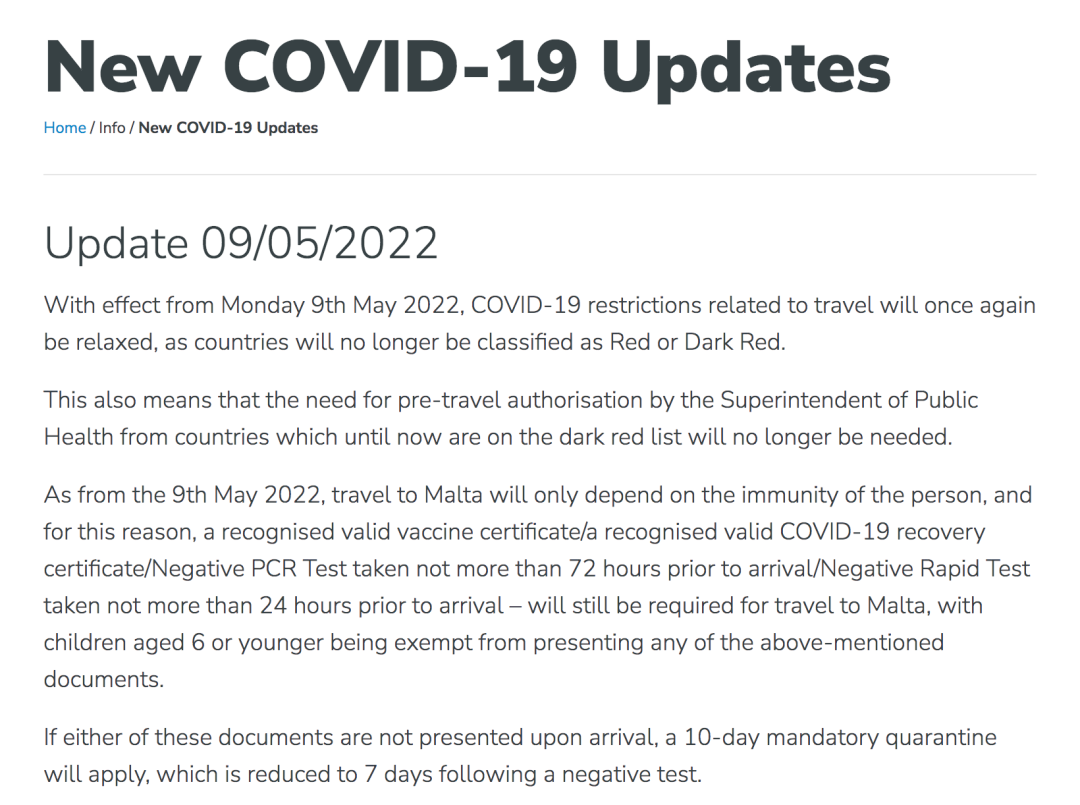 2022年5月7日,马耳他卫生部宣布调整有关入境防疫政策,宣布自2022年5月9日起,取消根据疫情严重程度将有关国家或地区划分为“红区”或者“深红区”的做法。任何国家或地区入境者,凡能提供以下证明材料之一,即可正常入境马耳他。