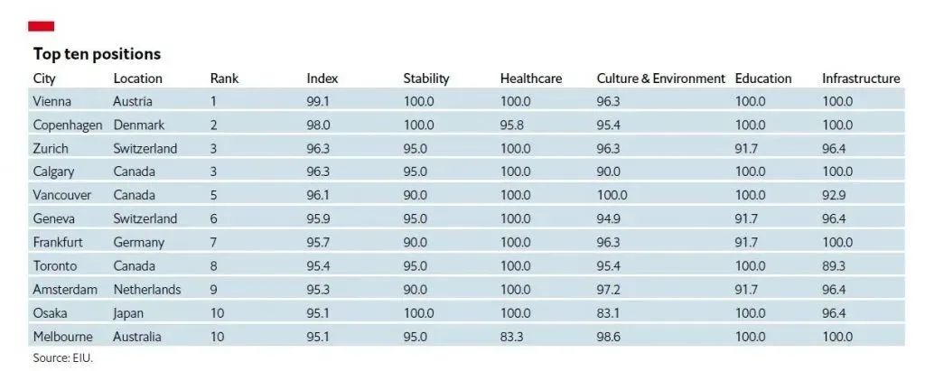 经济学人智库综合衡量了全球172座城市的安全、卫生、文化及环境、教育、基础设施情况,对犯罪、恐怖事件、医疗服务水平、食材及消费品供应和教育等30个指标进行评估。