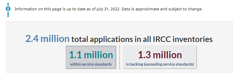 根据移民部这个新网页,所提供的数据,截止2022年7月,共有240万份积压,其中130万份的处理时间超标。