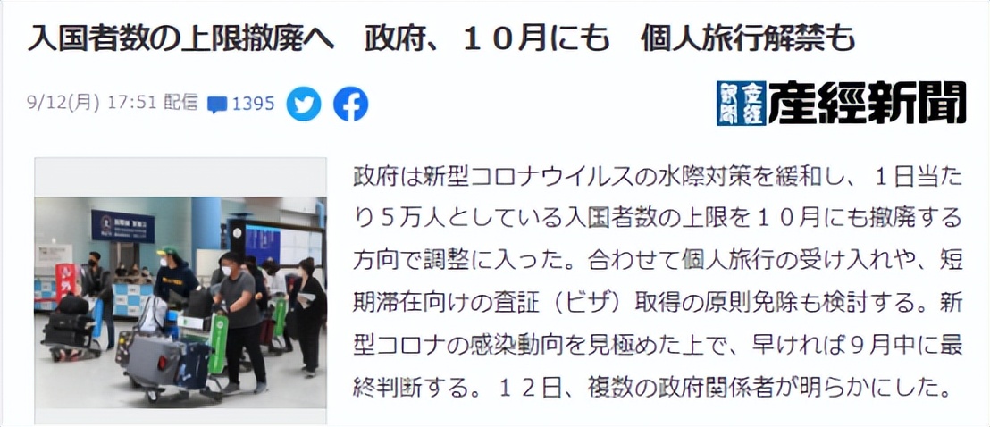 因为就在8月31日,日本政府刚决定进一步缓和入境政策,对接种完三次疫苗的人员免去72小时阴性证明书,并将每天的入境上限人数从2万人增加到了5万人。