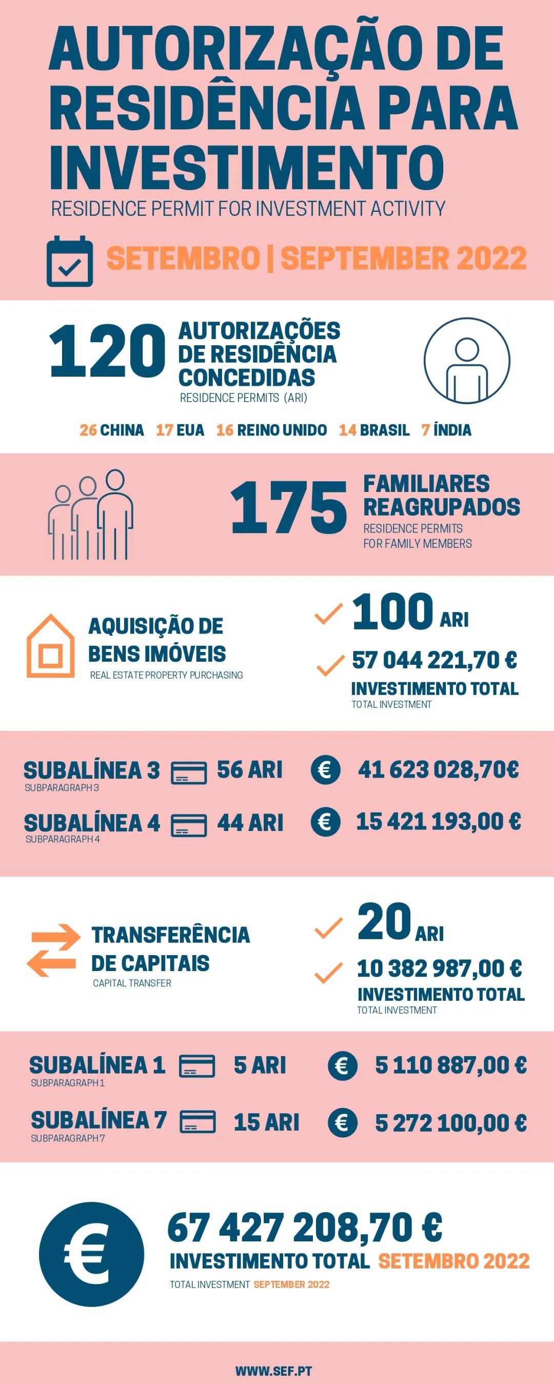 10月8日,葡萄牙移民局(SEF)正式发布了葡萄牙黄金签证的9月最新统计数据。2022年9月份,共计有120位主申请人和175位附属申请获批葡萄牙黄金签证,获批总人数为295人,总投资额约6743万欧元。