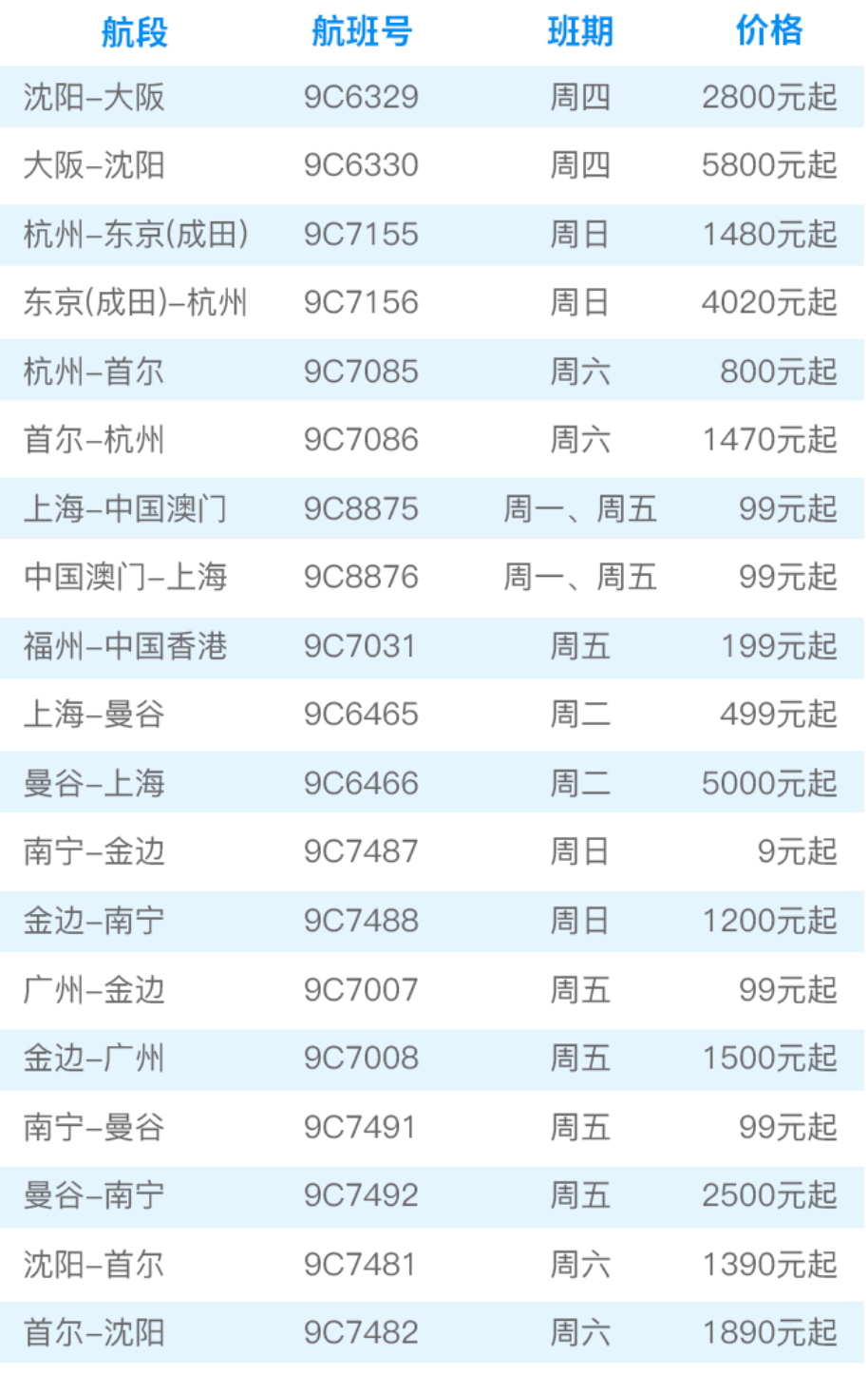 春秋航空方面,据10月13日官方微信公众号消息,10月14日起开通多条港澳、国际航线。国际航线方面包括沈阳-大阪、杭州-东京(成田)、杭州-首尔、上海-曼谷、南宁-金边、广州-金边、南宁-曼谷、沈阳-首尔等8条往返航线。