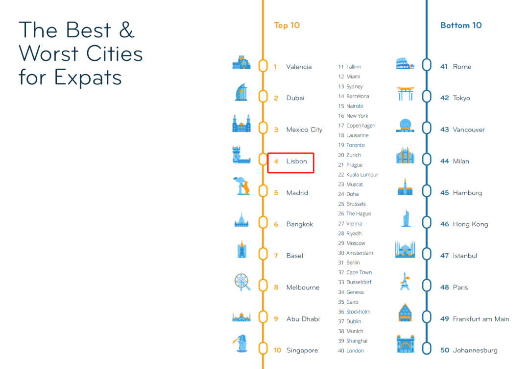 该报告由超过上万名生活在全球181个国家和地区的外籍人士参与调查,对全球50个城市进行了排名,评估标准包括生活品质、个人财务状况、海外工作以及定居难易度等。