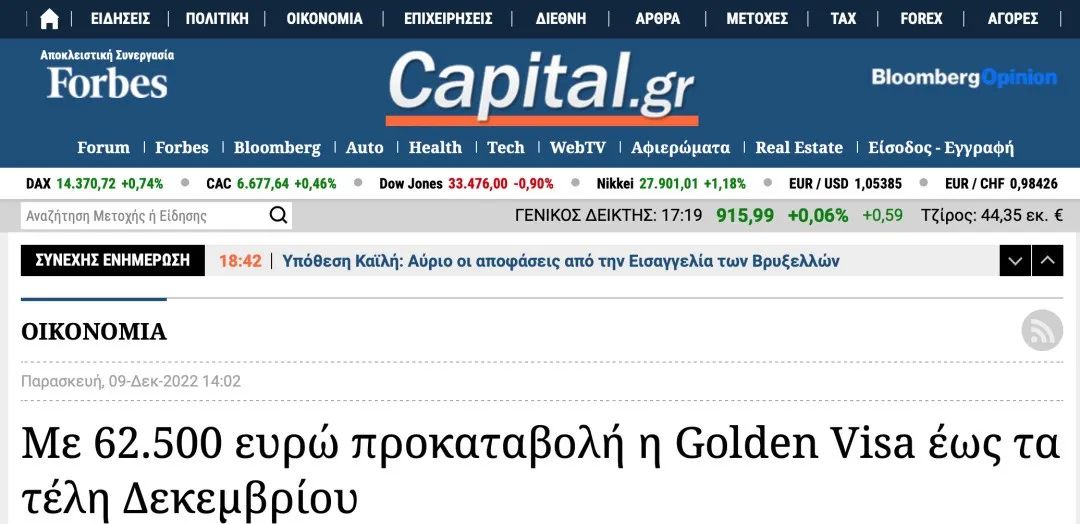 但希腊权威商业媒体Capital.gr在12月9日引述发展与投资部内部消息指,“黄金签证”将从2023年1月1日起涨价,实施细节框架已有雏形。